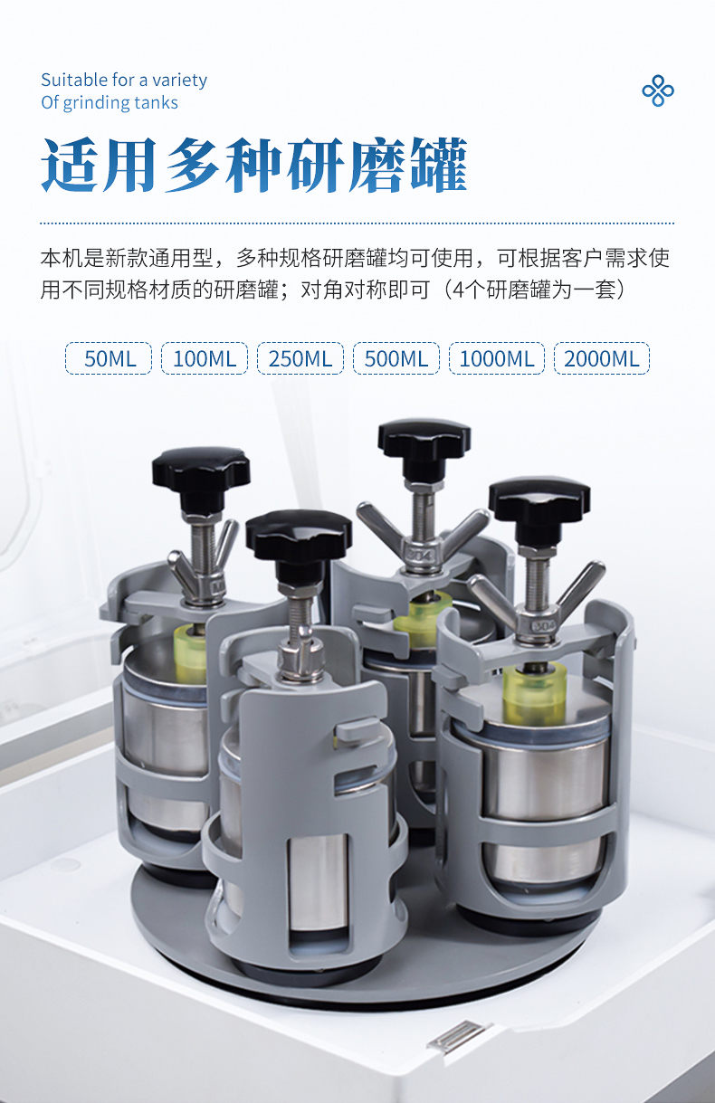 1. 適用研磨罐:本機是新款通用型,50ml、100ml、250ml、500ml、1000ml、2000ml六種規(guī)格研磨罐均可使用,可根據(jù)客戶需求使用不同規(guī)格材質(zhì)的研磨罐;對角對稱即可(4個研磨罐為一套)。
